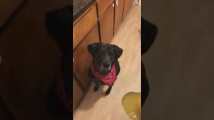 En man ger en pickle på hunden för att se hans reaktion.