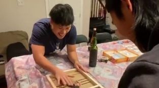 Två män spelar en hel del av spelet Le Passe Trappe (eller 'Snabb Sling Puck'), ett träbord där målet är för spelaren att bli av med alla bitarna så snart som möjligt, skicka [...]