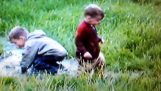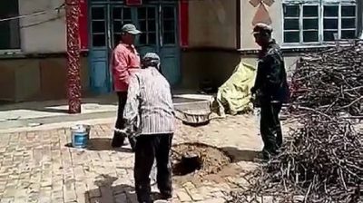คนงานชาวจีนใช้เทคนิคใหม่สำหรับการขนส่งปูนบนหลังคาที่ยังง่ายเกินไป. แทนที่จะไปขึ้นและลงบันได, เปิดตัวโคลนที่มีหนังสติ๊กชั่วคราว.