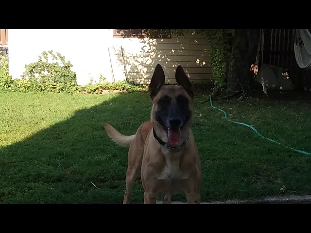 ผ่านการฝึกอบรมอย่างรวดเร็ว Malinois เบลเยียมรันคำสั่งของเจ้านายของเขา, รอคอยอย่างอดทนที่จะเล่นกับลูก.