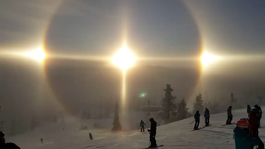 ในสกีรีสอร์ท Vemdalen ในสวีเดน, ปรากฏการณ์ที่หาได้ยากที่เรียกว่า 'เอฟเฟกต์รัศมี' หรือ Parhelion ก็ปรากฏให้เห็น. มันเป็นภาพลวงตา, เนื่องจากการหักเหของรังสีแสงอาทิตย์ผ่านล้านของผลึกน้ำแข็งหกเหลี่ยมลอยอยู่ในท้องฟ้า.