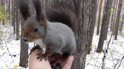 คนในป่ารัสเซีย, ดึงดูดกระรอกและนกถือดอกทานตะวันในมือ.