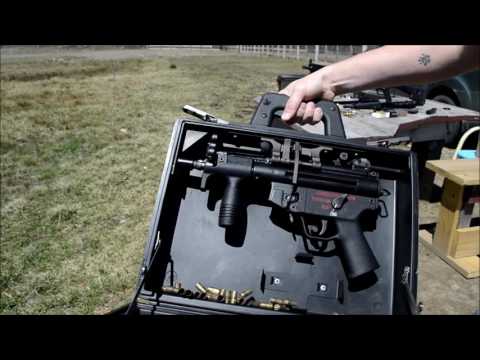 คนที่ทำให้การสาธิตการดับเพลิงที่มี MP5 HK, ปืนกลมือ, คงอยู่ภายในกระเป๋าเดินทาง.