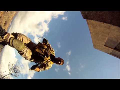 เล่นปืนตกจากหลังคาสองชั้นในระหว่างเกมปืนอัดลม.