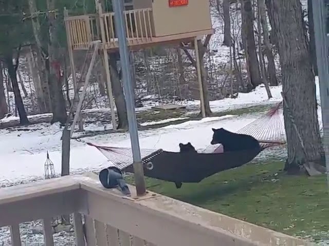ในบ้านของบ้านในคอนเนตทิสหรัฐอเมริกา, หมีสามหนุ่มพยายามที่จะนอนบนเปลญวนไม่ประสบความสำเร็จ.