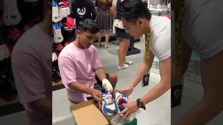 ในร้านกีฬาในประเทศมาเลเซีย, ชายคนหนึ่งที่ทำให้ผู้ขายหลอกลวงวิ่งออกไปด้วยรองเท้าผ้าใบเขาต้องการที่จะทดสอบ.