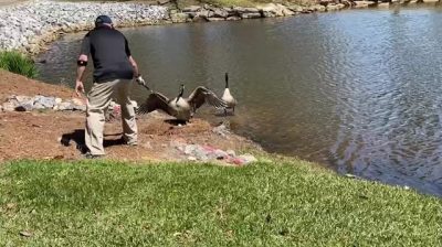 นักกอล์ฟบังเอิญส่งลูกเข้าไปในรังของห่านคู่หนึ่ง. ห่านปกป้องลูกบอลราวกับเป็นไข่ของตัวเอง.