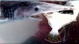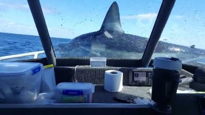 วันเสาร์ที่ 5 พฤศจิกายน, 2022 ปิด Whitianga, นิวซีแลนด์, กลุ่มคนกำลังตกปลาหางยาวเมื่อฉลามมาโกะ, ได้เหยื่อ, กระโดดขึ้นจากน้ำแล้วลงจอดที่หน้าเรือ. ปลา, ยาวกว่า 2 เมตร, แล้วติดอยู่บนเรือประมงไม่กี่นาทีก่อนจะกลับลงน้ำได้, ปลอดภัย ไร้กังวล.