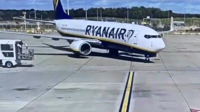 เครื่องบิน Ryanair ชนกับรถบรรทุกสัมภาระขณะจอดที่สนามบิน London Stansted เมื่อวันที่ 4 ตุลาคม 2023.