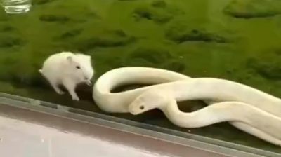 งูพยายามจับหนูที่ผ่านไป, แต่พลาดและกัดหางของเขา.