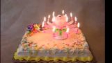 บาริสต้าเตรียมคาปูชิโน่วันเกิดพร้อมภาพที่ไม่เป็นทางการสำหรับสาววันเกิด. เขา“ ดึง” เค้กที่มีเทียนออกจากฟองนม.