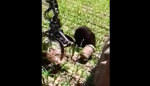 Woodcutters ที่พบหมีมีเบะคอนเทนเนอร์ใหญ่ของนมบนหัวของเธอ, โดยใช้เครนขนาดล็อกเพื่อช่วย.