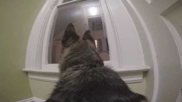 กล้อง GoPro ที่ด้านหลังของสุนัขเลี้ยงแกะของเยอรมัน, บันทึกเวลาของความเหงาและขาดความอดทนที่ผ่านไปในบ้าน, ถึงส่งคืนเจ้าของ.
