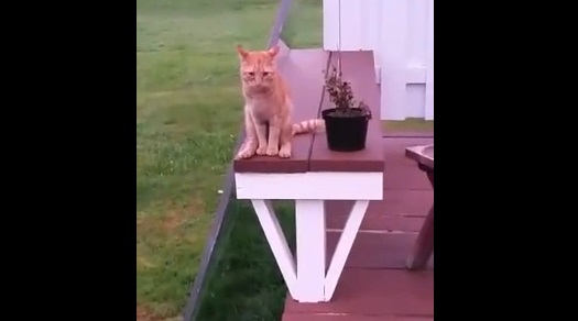 ในหมู่บ้าน Polant ในรัฐโอไฮโอของสหรัฐ, คอร์ดแมวของผู้หญิง, สีแดง, นั่งอยู่บนขอบของตาราง. เช่นคน, แมวจะตรึงกางเขนขาของเธอ และจะผ่อนคลายชมขอบฟ้า.