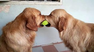 สองสุนัขโกลเด้นเว็ปกำลังต่อสู้สำหรับลูกเทนนิสที่มีคว้าเป็นส่วนหนึ่งของวัตถุที่มีปาก, และไม่มีใครดูเหมือนว่าจะกลับ. ที่สามจะได้รับประโยชน์จากสถานการณ์นี้, [...]