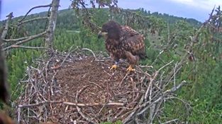 นกอินทรีมีหางขาวล้มเพื่อแผ่นดินได้อย่างราบรื่นที่รัง, ในต้นไม้ใกล้ Durbe ในลัตเวีย. นกอินทรีมีอุปสรรคกิ่งไม้ และอยู่สำหรับไม่กี่วินาที aporimenos ที่ขอบของรัง, ด้วย [...]