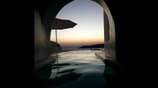 ในห้องพักของโรงแรมสนามบินในซานโตรินี, หน้าต่างห้องน้ำเชื่อมต่อโดยตรงสู่ระเบียงสระน้ำ.