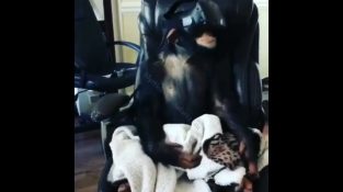 คนป่าลี้ภัยจากเสือใน Noita แคโรไลนาของสหรัฐอเมริกา, ให้ชิมแปนซีเพื่อทดสอบหมวกกันน็อคเสมือนจริง.