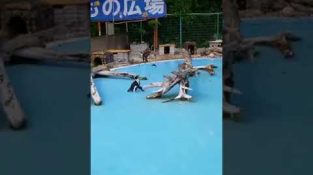 เพนกวินพยายามที่จะจับผีเสื้อในสวนสัตว์.