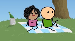 มีชายและหญิงนั่งอยู่ในทุ่งหญ้าและเมฆมอง, เมื่อจู่ๆ... แอนิเมชั่นสั้นจากซีรีส์ Cyanide & Happiness.