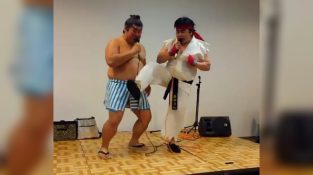 ในการแสดงละครเวทีในญี่ปุ่น, ชายสองคนสวมบทบาทเป็นตัวละคร Edmond Honda และ Ryu จากวิดีโอเกมชื่อดัง “Street Fighter 2”. ทำซ้ำท่าทางของนักสู้ในขณะที่ความนับถือเลียนแบบและผลกระทบเสียงของเกม.