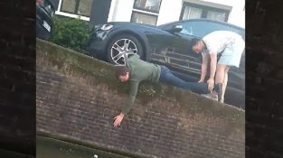 คนเมาพยายามที่จะช่วยเพื่อนของเขาที่จะจับกระป๋องเบียร์, ซึ่งกำลังนอนอยู่ในน้ำของช่องทางในอัมสเตอร์ดัมที่.