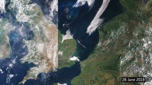 ภาพจากดาวเทียมขององค์การอวกาศยุโรป (อีเอสเอ) มากกว่าภาคเหนือของยุโรป, เผยผลมาจากภัยแล้งที่รุนแรงเจ็บปวดรวดร้าวทวีปในช่วงสามสัปดาห์ที่ผ่านมา.