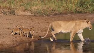 สิงโตทำตามแม่ของพวกเขาลงไปในน้ำ