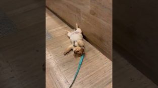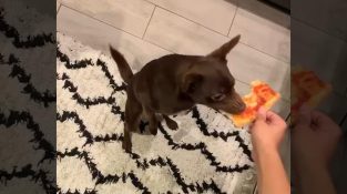 สุนัขขนาดเล็กที่อยากจะกินพิซซ่า, แต่ชิ้นส่วนที่ติดอยู่ในฟันกรามบน. แล้วนอนอยู่กับเปิดปากของเขา, โดยไม่มีความสามารถที่จะกลืนชิ้น.
