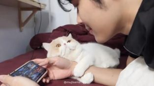 แมวในประเทศไทยโอบกอดเจ้าของมือของเขาในขณะที่เขาเล่นกับมือถือของเขา.