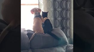 โอ้บ่อ, สุนัขบีเกิ้ล 5 เดือน, นั่งอยู่ข้างเพื่อนแมวของเขาแจสเปอร์ในด้านหน้าของหน้าต่าง, สหรัฐอเมริกาอินดีแอนา.