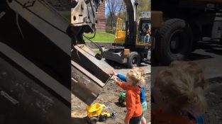 ผู้ให้บริการรถขุดให้ความบันเทิงกับเด็กเล็กสองคน