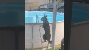 ในเซาท์แคโรไลนาสหรัฐอเมริกา, สุนัขต้องการทำให้เย็นลงด้วยการอาบน้ำในสระของบ้าน.