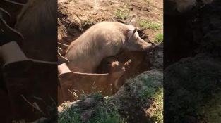 คนงานใช้รถขุดเพื่อช่วยหมู, ซึ่งตกลงไปในหลุมใกล้กับสถานที่ก่อสร้างในรัสเซีย. ค่อยๆจับสัตว์ด้วยถังขุดและนำมันมาอย่างช้าๆ [...]