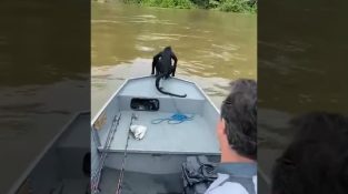 ในประเทศบราซิล< ένας μακάκος εντοπίζεται από δύο ψαράδες να κολυμπάει μέσα σε ένα ποτάμι. Ο μακάκος θα πηδήξει πάνω στη βάρκα, περιμένοντας να φτάσει μέχρι την όχθη.