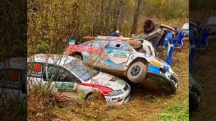 ระหว่างการแข่งขันแรลลี่ในรัสเซีย, รถหลายคันประสบอุบัติเหตุเหมือนกันในทางเลี้ยวเดียวกัน.
