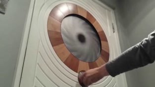 Simon Morse สร้างรูรับแสงม่านตาให้เหมือนกับกล้องถ่ายรูป, ทำหน้าที่เป็นคนตาบอดที่ช่องประตู.