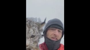 คริสพอลสันชาวนาชาวแคนาดาอุ้มแมวป่าชนิดหนึ่งออกมาจากเล้าโดยเอาต้นคอ, ซึ่งแอบอยู่ที่นั่นและทำร้ายไก่ของเขา.