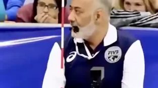 การแสดงออกทางสีหน้าของผู้ตัดสินวอลเลย์บอลอิหร่าน Farhad Shahmiri, ซึ่งอยู่ในการแข่งขันกีฬาโอลิมปิก 2008 สามครั้ง, 2016, 2020.