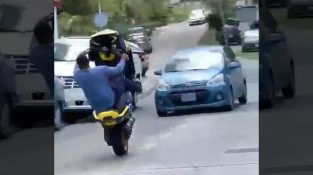 ชายคนหนึ่งขยับซูซาบนมอเตอร์ไซค์, ลงเอยด้วยการชนกับรถที่วิ่งมาทางตรงข้าม.