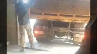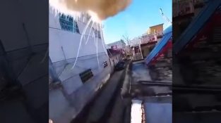 ชายคนหนึ่งในเมือง Zaporizhia ประเทศยูเครน พยายามเปิดประตูรถบรรทุกที่บรรทุกทุ่นระเบิดต่อต้านรถถัง. โชคดี, โดยไม่ต้องวางระเบิด, เหมืองไม่ได้เปิดใช้งาน.