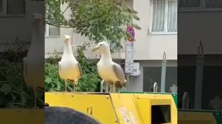 นกนางนวลสองตัวดูเหมือนกำลังหัวเราะคิกคัก.