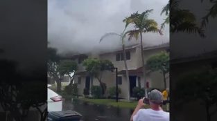 คลื่นยักษ์พัดผ่านหลังคาบ้าน 2 ชั้นที่หันหน้าออกสู่ทะเล, ใน Kahaluu-Keauhou ฮาวาย.