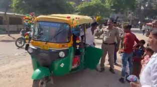 ตำรวจท้องที่ใน Fatehpur-Sikri ประเทศอินเดีย, รถสามล้อหยุด (รถตุ๊กตุ๊ก) ซึ่งบรรทุกคน 27 คน. รถถูกยึด.
