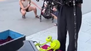 ถัดจากนางพญายืนอยู่หน้าปีกที่ทาสีไว้, นกยืนอยู่หน้ามือที่ทาสีใช่, มันเป็นนกปลอม.