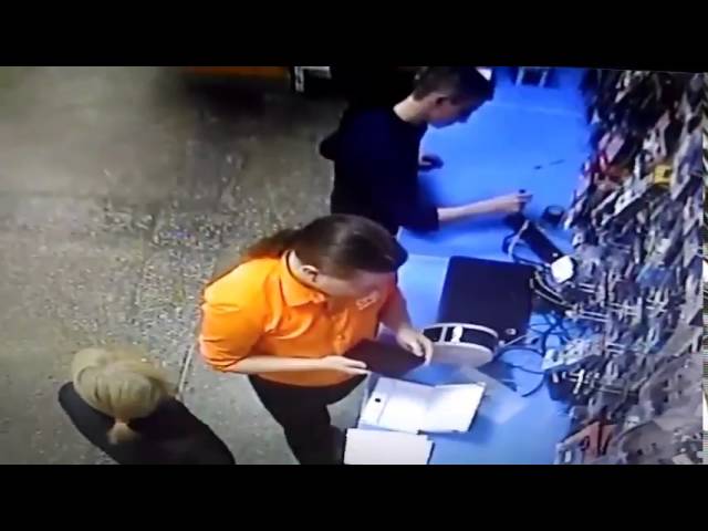 Rusya'da elektronik mağazasında, genç bir adam, bir güç şeridi bir makas jack yerleştirir. Doğal seleksiyon olması gerektiği gibi işe yaramadı, Bir daha.