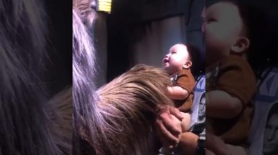 Çin'in Şanghay kentindeki Disney Resort Park'ta, bir bebek özellikle Star Wars filmlerinden Chewbacca ile tanıştığında mutluydu.