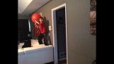 Bir bebek, babasının kendisi için yaptığı mini asansörü deniyor.