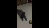 Bir yavru kedi, sahibinin köpeği okşama hareketlerini taklit eder..