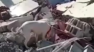 Video, sadık bir köpeğin Türkiye'de bir binanın enkazını nasıl kazmaya çalıştığını gösteriyor.. efendisini aramak için, dişlerinin arasında bir parça ekmekle dolaşıyor.